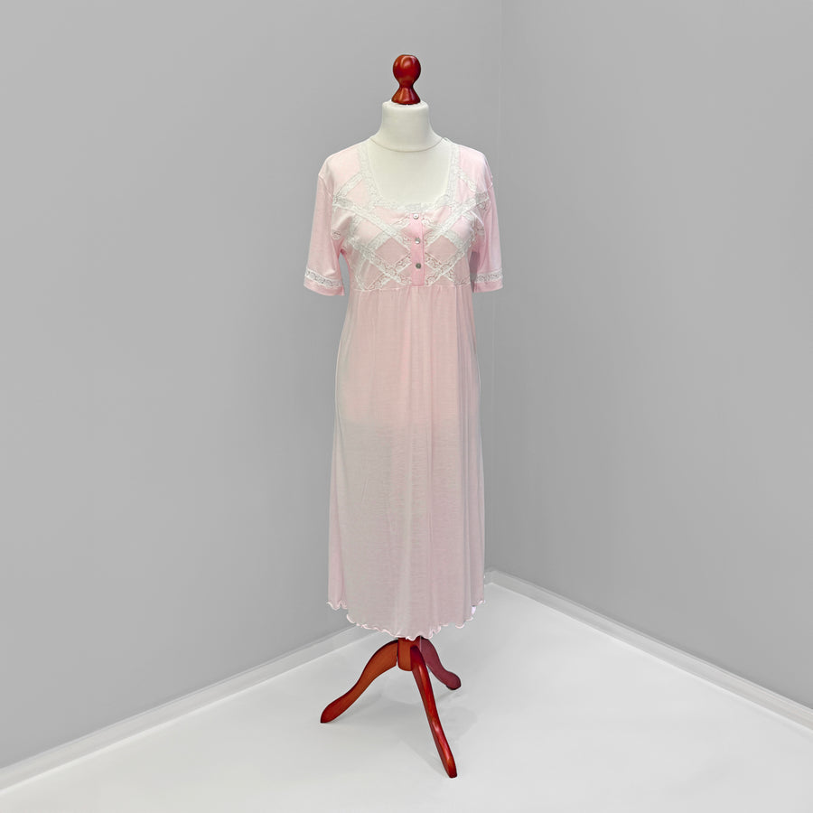 Gemma is our short-sleeve nightgown with a squared neckline and it is enriched with geometric details in fine laces.
