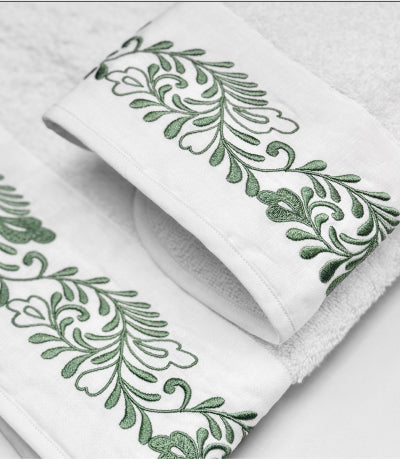 The crown jewel of our embroideries, Incroci is the fruit of meticulous craftsmanship. Entirely hand-drawn and worked with the chain stitch technique, it is applied to a fine linen crepe band. Choose the color and combination that best suits your bedroom or bathroom set.